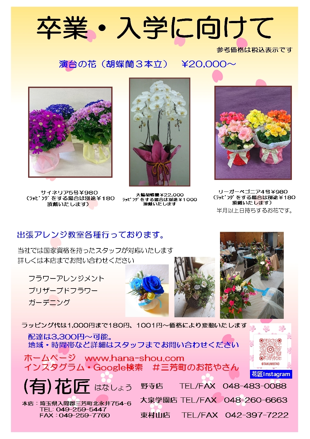 花束はお祝いの他にもお供えや演台用も受付しています。