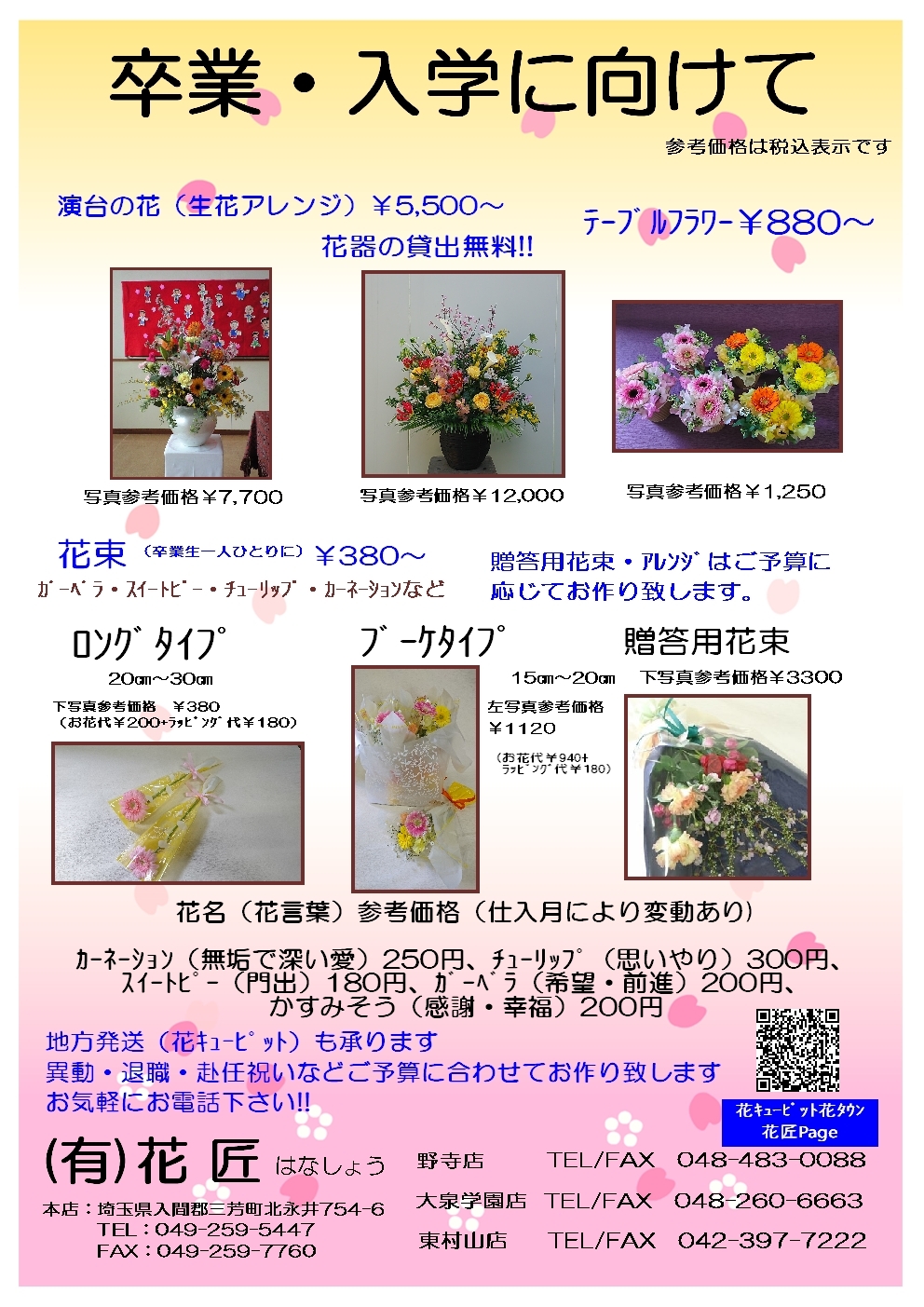 | 切花は2日に1度入れ替えをしていますので、花の新鮮度が違います。 特に白菊は品質にこだわった良い物を入れてますので、日持ちも違います。 また、プリザーブドフラワーは当店オリジナルの商品で同じものが1つと無いオンリーワン商品です。 お気軽にお問合せください。 |